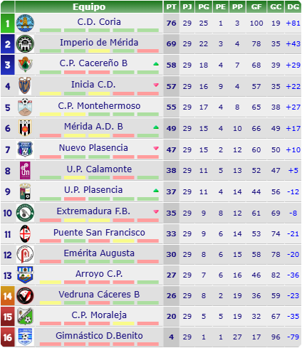El Cacereño B se hace fuerte en la 3ª plaza alcanzando los 58 puntos (68 GF, 39 GC) tras vencer en el derbi local. El Nuevo Cáceres se queda 11º con 33 puntos.